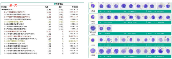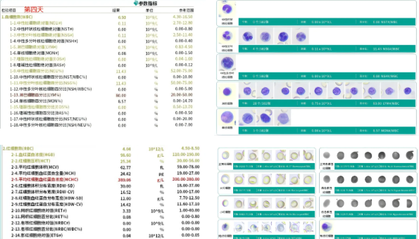 Unter Beobachtung der Morphologie der Linie der weißen Blut körperchen im oberen rechten Bild wurden in der Bilddaten bank dieser Test probe nur 4 Neutrophilen mit segmentierten Neutrophilen gefunden, während 0 Neutrophilen mit Band-Neutrophilen und mehrfach segmentierten Neutrophilen gefunden wurden, was auf eine starke Abnahme der Anzahl von Neutrophilen und eine schlechte Prognose.