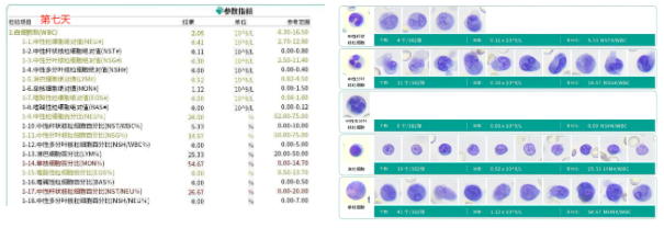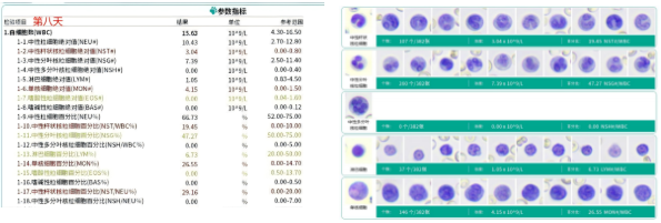 Ergebnis analyze: Wie in der linken Abbildung gezeigt, nahmen die Gesamtzahl der weißen Blut körperchen, die Anzahl der Neutrophilen und die absolute Anzahl der segmentierten Neutrophilen zu, aber die Anzahl der weißen Blut körperchen blieb auf einem niedrigen Niveau, was darauf hinweist, dass der Patient noch nicht außer Gefahr ist und sollte nicht selbst gefällig sein. Der erhöhte Prozentsatz an Band-Neutrophilen (NST/NEU %) weist auf einen Anstieg der unreifen Neutrophilen hin, was auf eine verbesserte Knochenmark produktion und eine Erholung der hämato poetischen Kapazität hindeutet. Die rechte Abbildung zeigt den Nachweis von band-und segmentierten Neutrophilen, was auch die Knochenmark produktion bestätigt. Die unregelmäßigen pleo morphen Veränderungen in den weißen Blut körperchen deuten jedoch darauf hin, dass die Infektions phase noch andauert und eine weitere Behandlung erfordert.