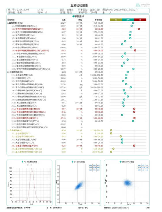 2. The dog is in the early stage of acute inflammation: Based on the CRP results, the total number of neutrophils is not significantly increased, but the number of band neutrophils is increased, indicating that the bleeding has led to bacterial infection in the digestive tract, and the dog is in the early stage of acute inflammation.