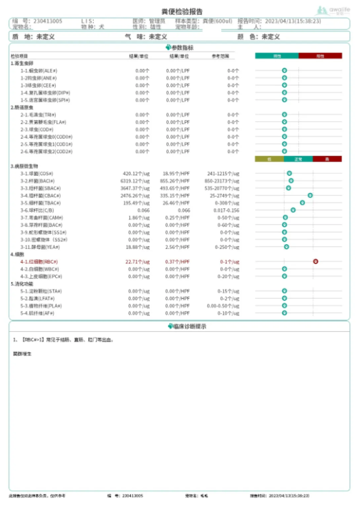 In this case, the blood and stool analysis by the Anlu Formed Component Analyzer enabled the early detection of inflammation progression and bleeding. Furthermore, the combined blood and stool analysis corroborated each other in the diagnosis of gastrointestinal bleeding and infection, thus improving the accuracy of the diagnosis.